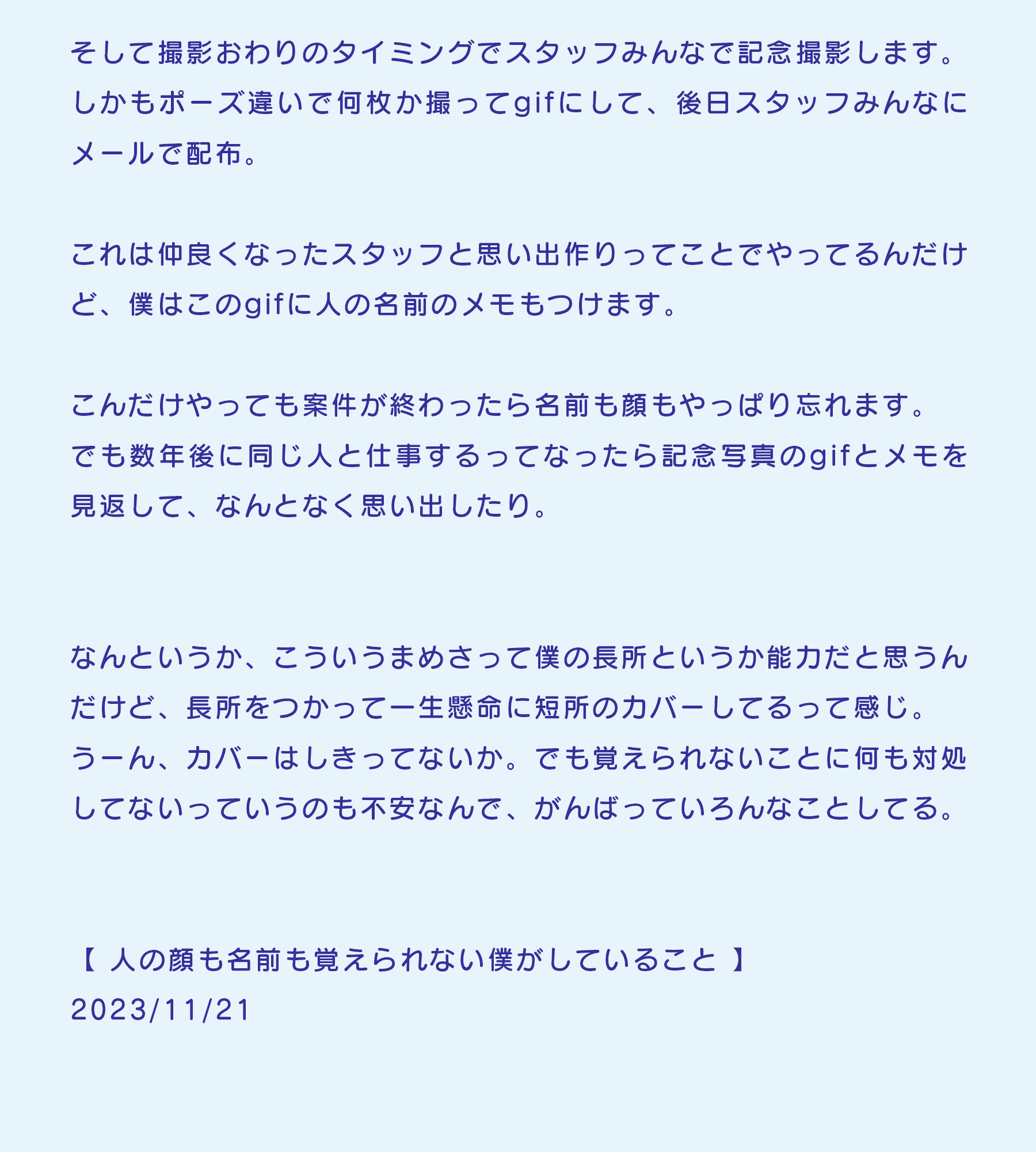 でも数年後に同じ人と仕事するってなったら記念写真のgifとメモを見返して、なんとなく思い出したり。