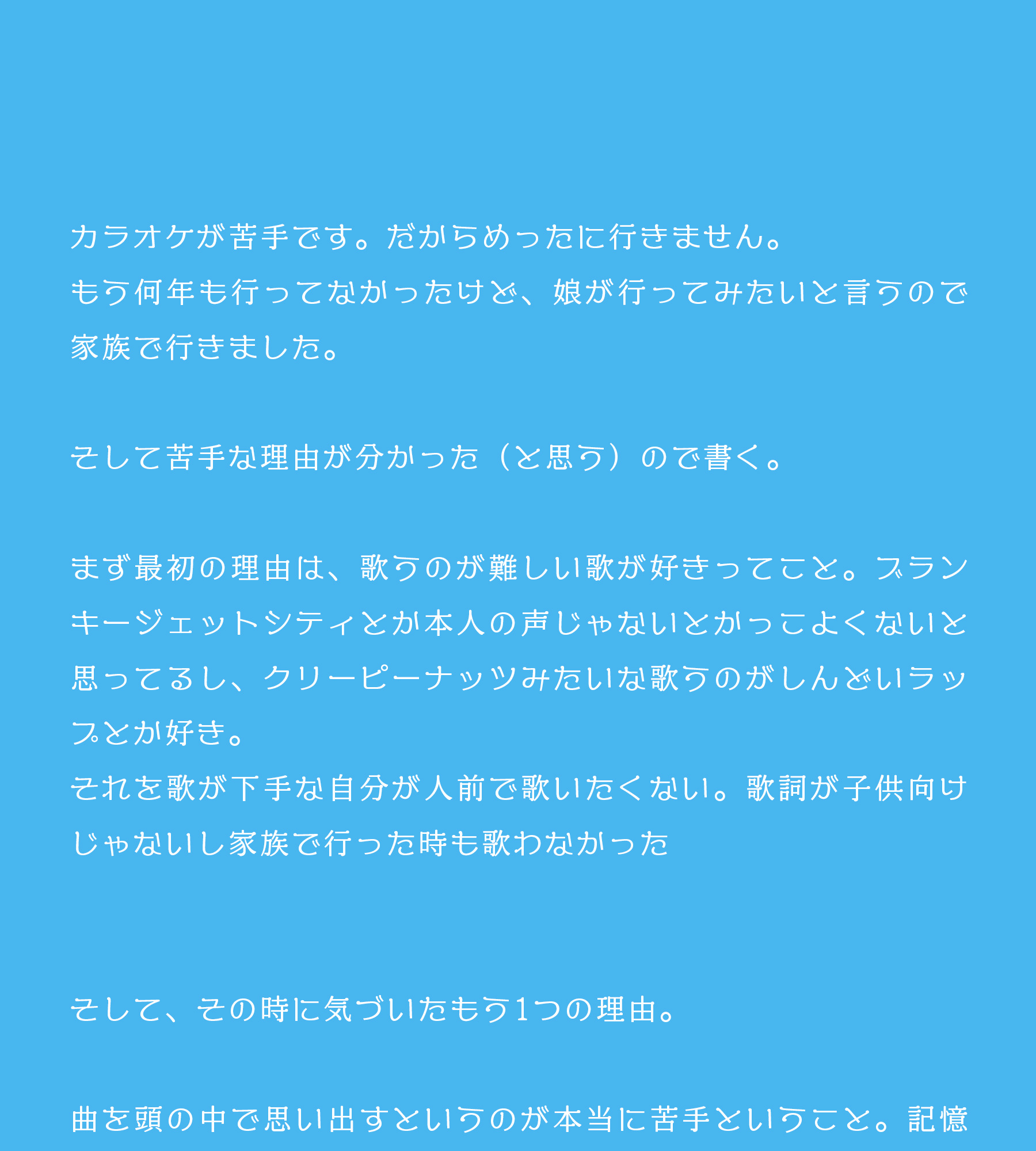 それを歌が下手な自分が人前で歌いたくない。歌詞が子供向けじゃないし家族で行った時も歌わなかった