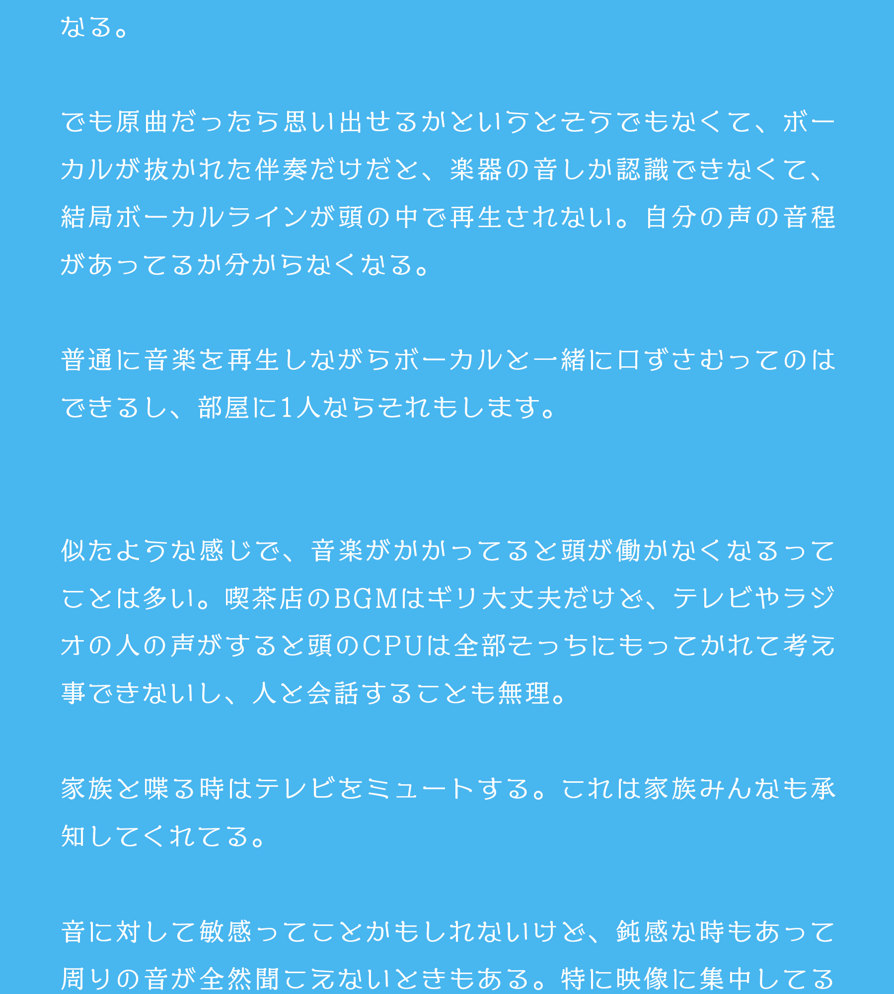 そして目の前で別の曲が流れていたら、まったく頭が働かなくなる。カラオケで目の前で歌ってる人がいる時に、別の曲について考えることが無理。脳のCPUをいま聞こえてる音に全部支配される感覚。