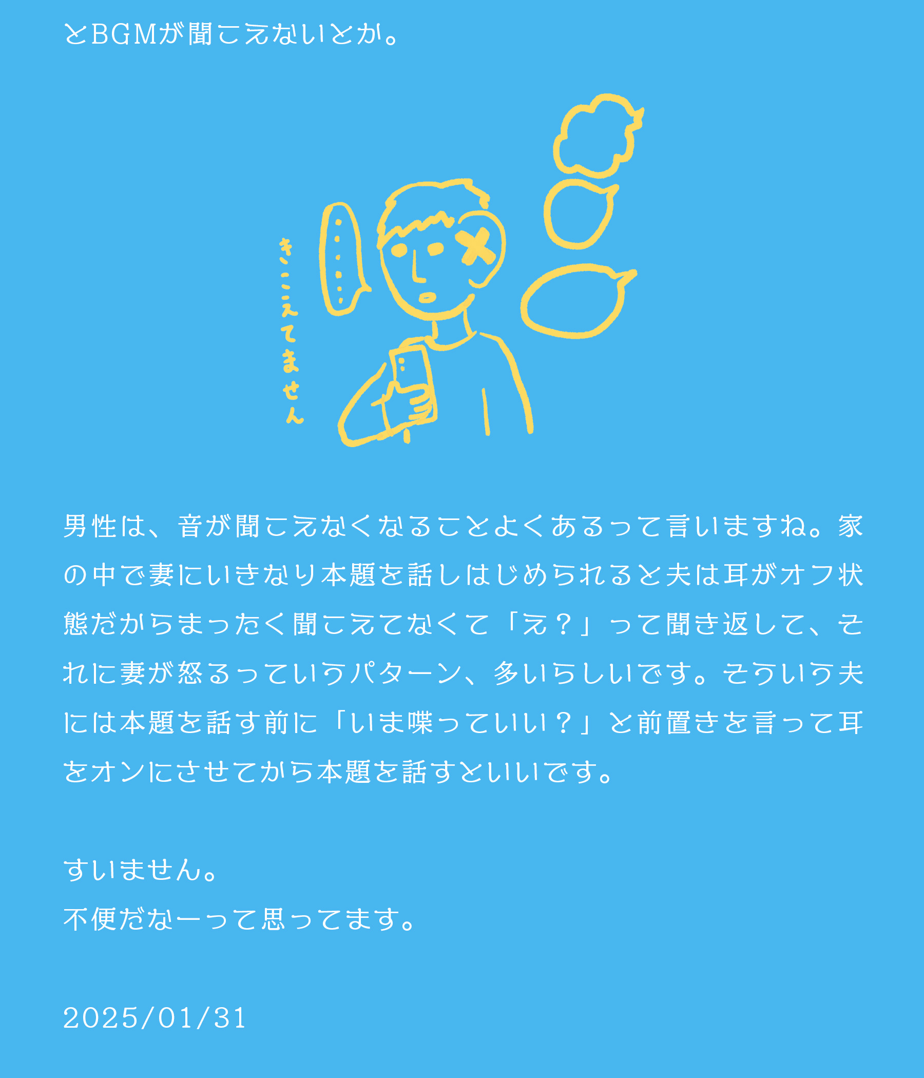 男性は、音が聞こえなくなることよくあるって言いますね。家の中で妻にいきなり本題を話しはじめられると夫は耳がオフ状態だからまったく聞こえてなくて「え?」って聞き返して、それに妻が怒るっていうパターン、多いらしいです。そういう夫には本題を話す前に「いま喋っていい?」と前置きを言って耳をオンにさせてから本題を話すといいです。